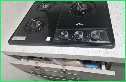 8. 이것저것 생각하다가 레인지 아랫부분을 살펴 보기로 하고 레인지 아래 서랍을 열고 레인지 아랫부분을 밀었습니다.