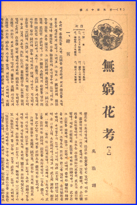 조선 급 조선민족에 일본어로 수록되었던 무궁화고(無窮花考)1927년 동광(東光)지 제13호에 無窮花考(), 15호에 無窮花考(), 16호에 無窮花考()가 연재 되었고, 無窮花考()19278월 동광(東光)지가 휴간됨으로써 끝을 보지 못하고 미완성으로 그치고 말았습니다.