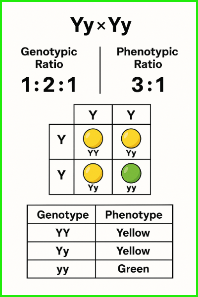 - 반대로 **초록색 유전자(y)**만 두 개 있을 경우(yy)에만 초록색(y)이 나타납니다.