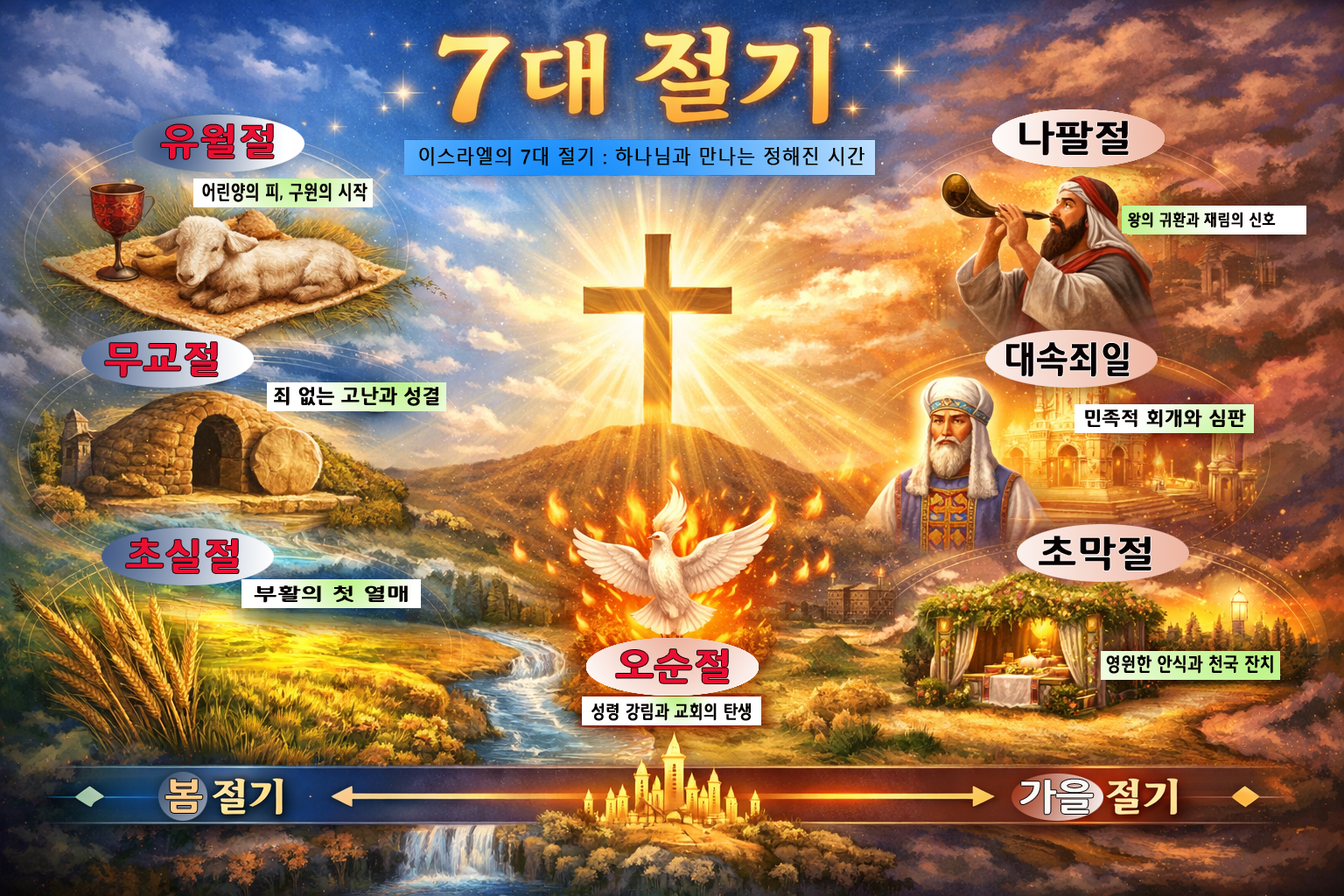 - 7대 절기는 하나님께서 당신의 백성과 만나 언약을 갱신하고 구원의 역사를 기념하기 위해 '미리 정하신 약속 시간'입니다.
