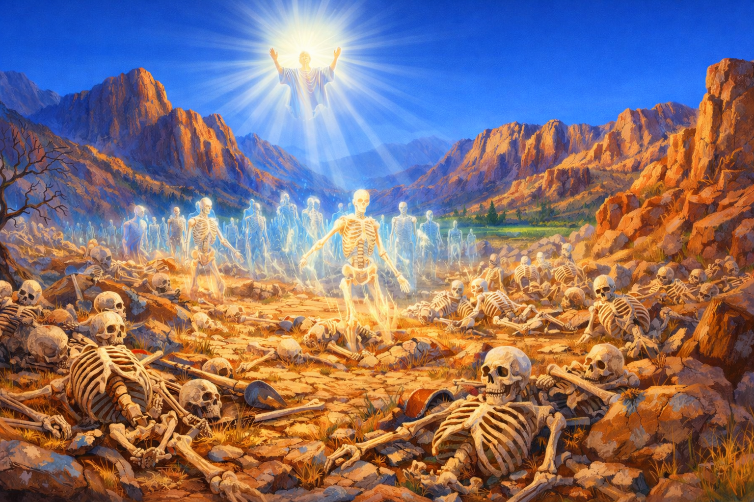 "여호와께서 권능으로 내게 임재하시고 그의 영으로 나를 데리고 가서 골짜기 가운데 두셨는데 거기 뼈가 가득하더라......이에 내가 명령을 따라 대언하니 대언할 때에 소리가 나고 움직이며 이 뼈, 저 뼈가 들어맞아 뼈들이 서로 연결되더라 내가 또 보니 그 뼈에 힘줄이 생기고 살이 오르며......생기가 그들에게 들어가매 그들이 곧 살아나서 일어나 서는데 극히 큰 군대더라"