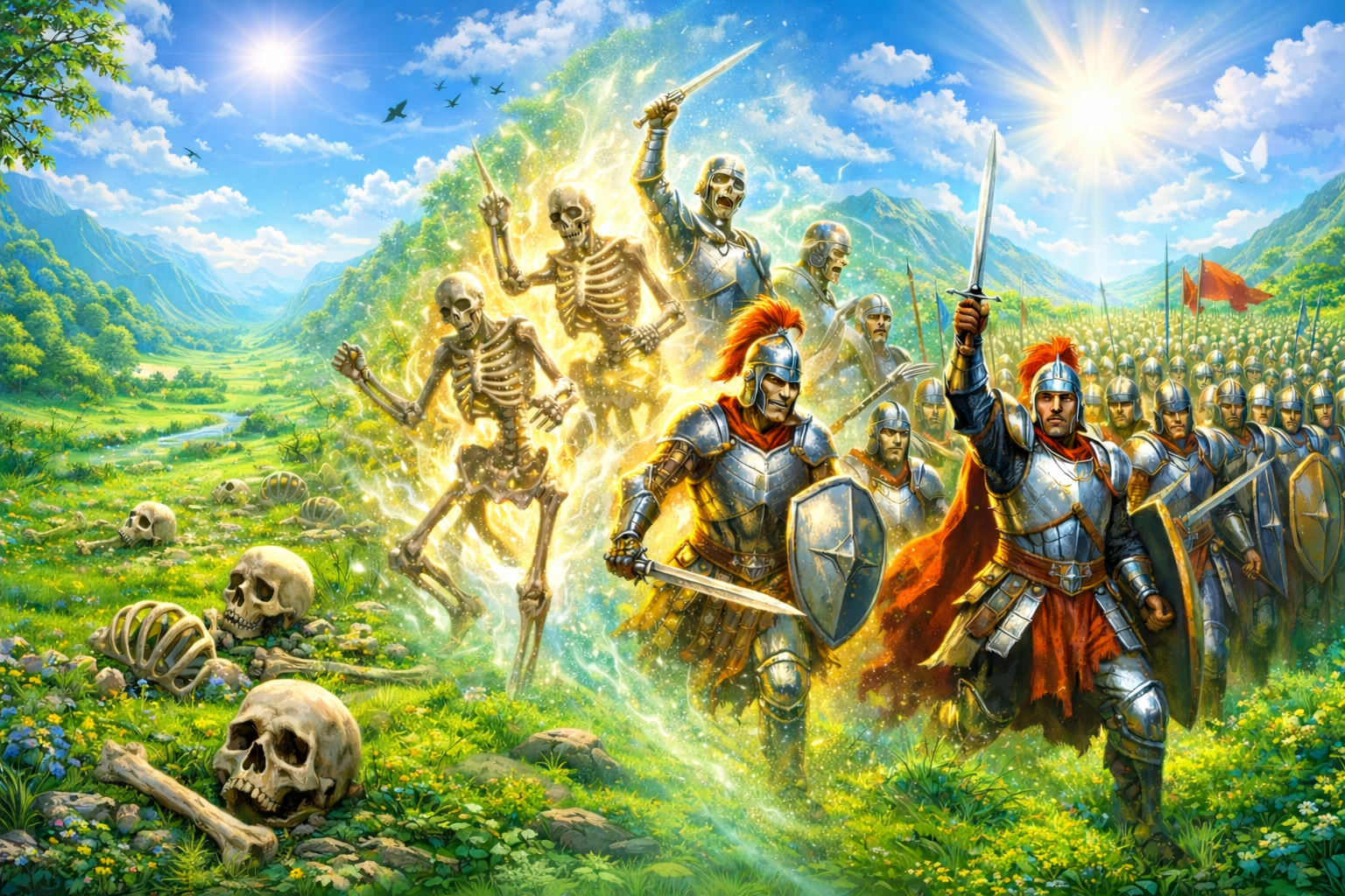마지막으로 하나님의 생기가 사방에서 불어오자, 그 마른 뼈들은 살아 일어나 "극히 큰 군대"가 되었습니다.