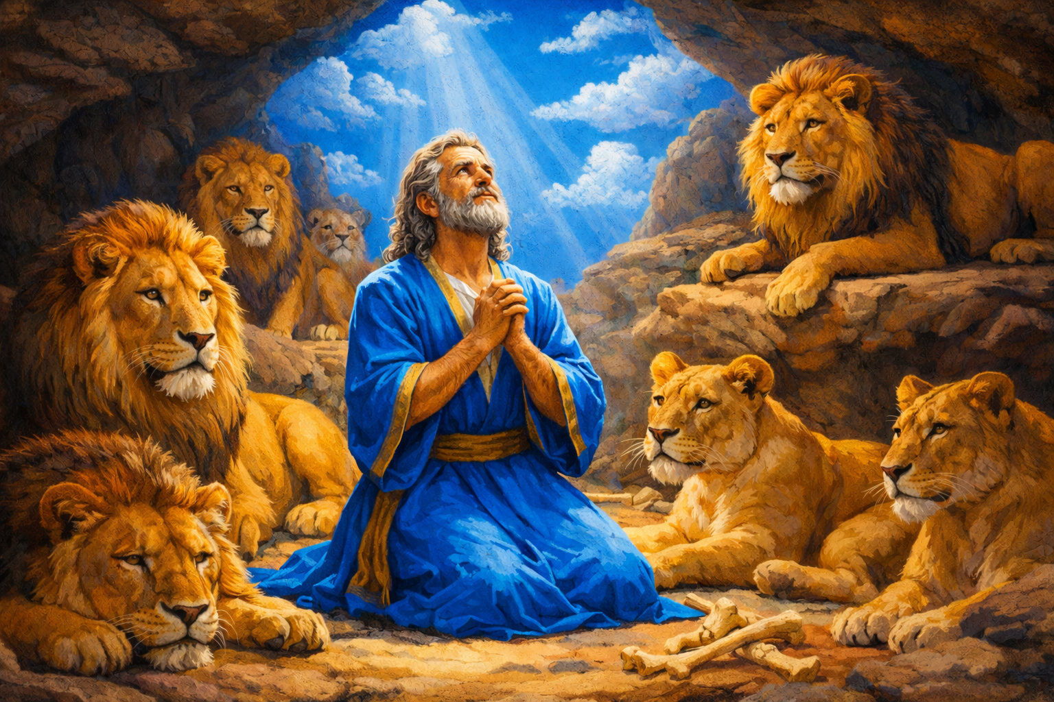 📌 결국 사자 굴에 던져졌지만, 하나님은 천사를 보내 사자들의 입을 막으셨습니다.
