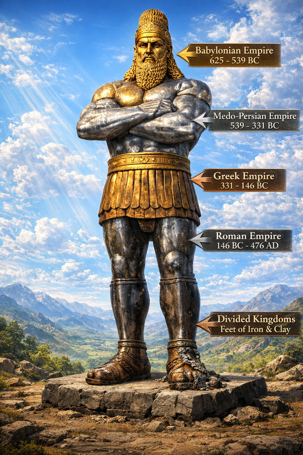 | 은 가슴과 팔 | 메대·바사 (B.C. 539~331) | 두 팔은 메디아, 페르시아 연합 제국을 의미합니다. 페르시아로 발전하여 광활한 영토를 다스립니다. |