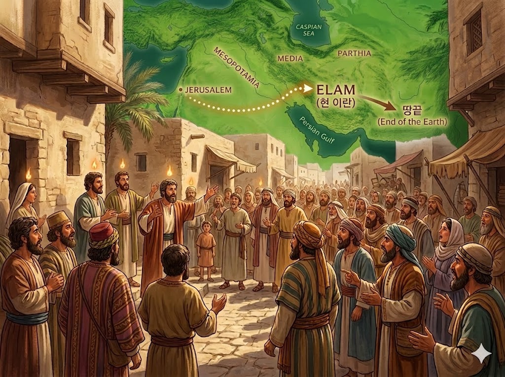 • 현대적 묵상 : 오늘날 이스라엘과 이란은 긴장과 갈등 속에 있지만, 성령 강림의 현장에는 엘람인들이 함께 있었습니다. 성령은 민족적 증오와 정치적 대립을 넘어 모든 열방이 복음 안에서 하나임을 선포하셨습니다. 이는 오늘날의 분쟁 속에서도 우리가 성령 안에서 화평을 구해야 할 이유를 보여줍니다. (엘람과 이란에 대해서는 다른 장에서 다시 정리하겠습니다. = 부요함)