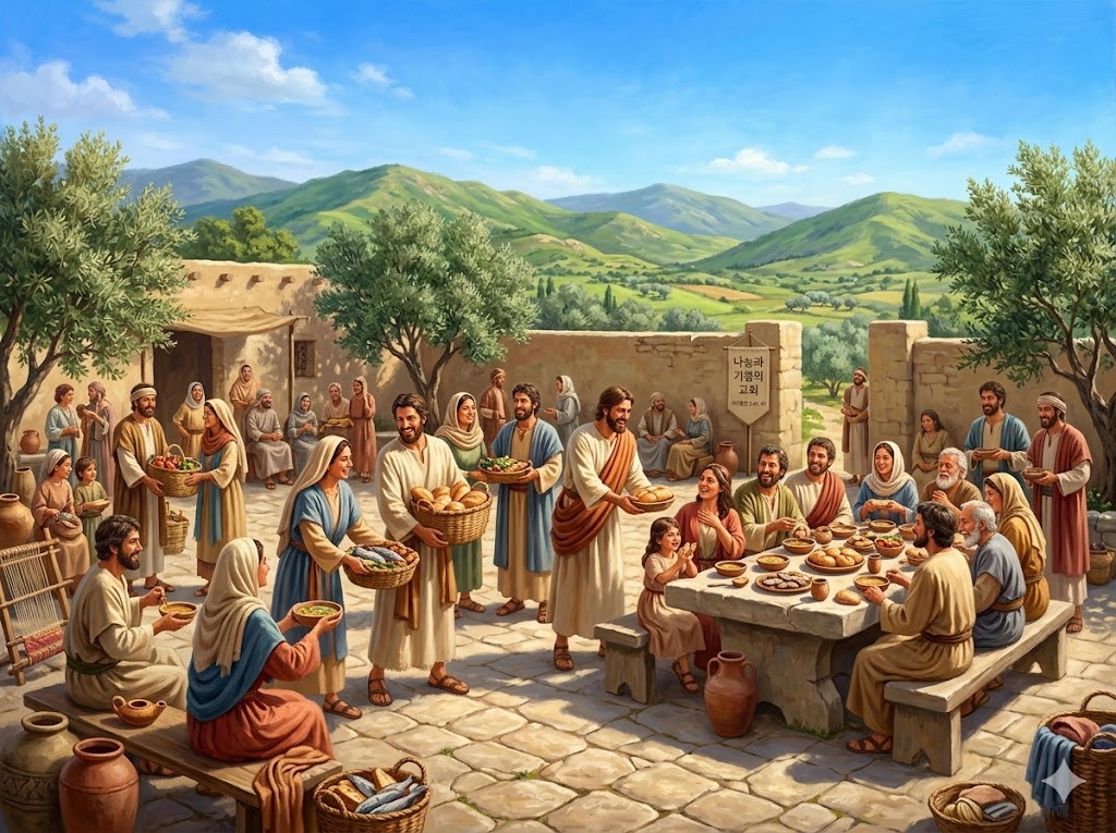 공동체의 모습 흩어짐과 개인적 안위 물건을 통용하고 기쁨으로 떡을 뗌