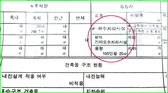 건축물 관리 대장 뒷면에 보면 정화조에 대한 설명과 용량이 표기되어 있습니다.