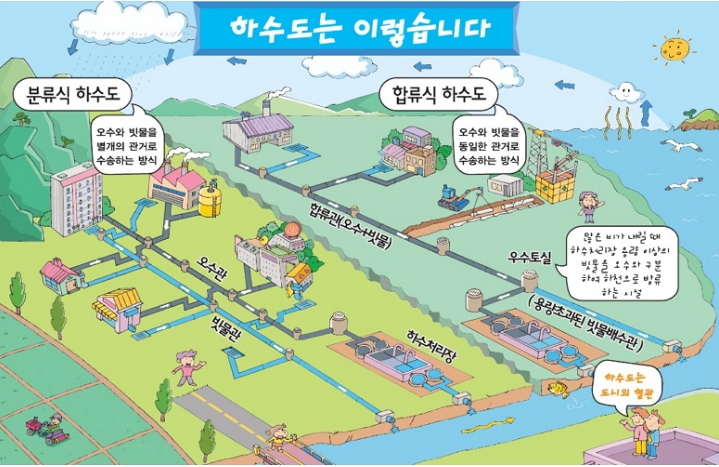 하수 : 빗물 등 우수와 생활에서 발생하는 모든 종류의 오수를 포함하는 개념으로 하수관으로 들어가는 모든 물을 하수라고 합니다.