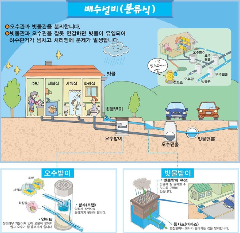 ◎ 분류식 하수관거 : 우수와 오수가 구분되어 흐르도록 한 하수관로를 말합니다.