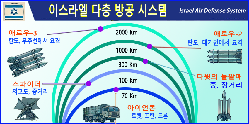 이 다층 방어 시스템은 이스라엘의 안보에 매우 중요한 역할을 하며, 이스라엘이 직면한 복잡하고 다양한 위협에 대응할 수 있는 중요한 방어 수단입니다.