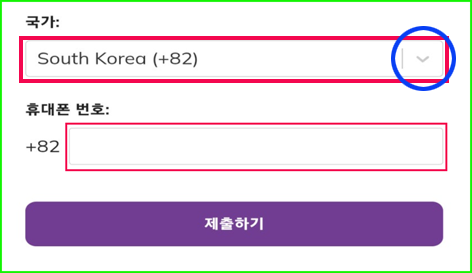 ▷ 클릭해서 → “ko”를 치고 살짝 올려서 → “South Korea (+82)” 선택하여 입력합니다.