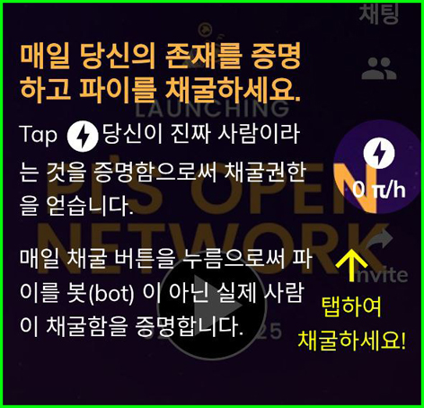 ◯ 오른쪽 중간의 번개 아이콘을 누르면 녹색으로 활성화되며 24시간 동안 자동으로 채굴이 이루어집니다.