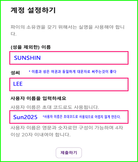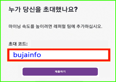 ◯ 본인을 초대한 분이 있으면, 그분의 초대코드를 받아서 넣고 초대한 분이 없는 경우에는 저의 초대코드 “bujainfo”를 입력해 주세요.