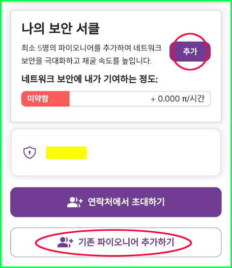▷ 이름 옆의 “+ADD”를 눌러서 최소 5명의 파이오니어를 추가하여 네트워크 보안을 극대화하고 채굴속도를 높인다.