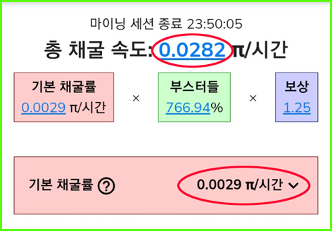 ▷ 모든 사람이 기본 채굴률은 동일하게 시간당 0.0029파이(PI)이다.