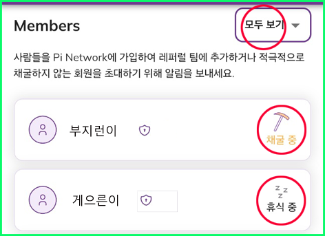 ▷ Members → “모두 보기”를 보면 나를 초대한 분과 내가 초대한 분들이 보이고, 채굴 중인지 휴식 중인지 표시가 된다.
