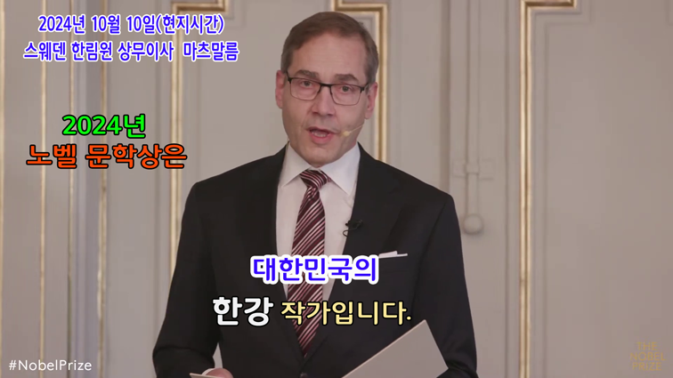 2024년 10월 10일, 한국 소설가 ‘한강’(54세)은 스웨덴 한림원으로부터 ‘노벨문학상’ 수상자로 선정되었다는 발표가 있었습니다.