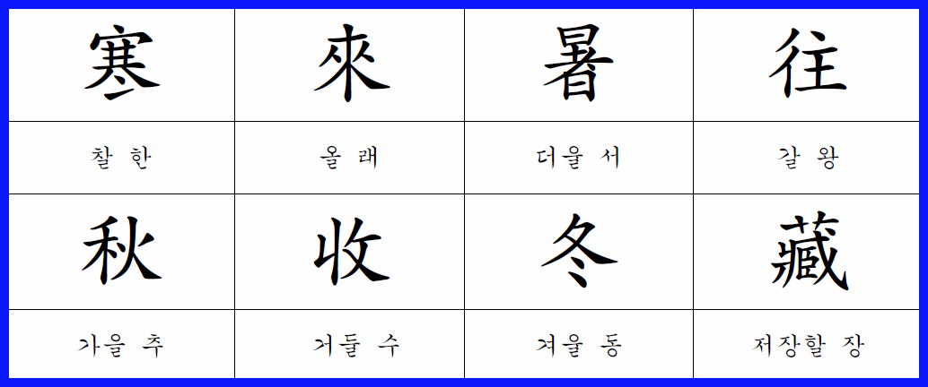 ‘하늘과 땅(天地玄黃)’, ‘해와 달(日月盈昃)’에 이어, 이제는 사계절의 순환, 곧 자연의 리듬을 다루는 구절,「寒來暑往 秋收冬藏(한래서왕 추수동장)」을 함께 살펴봅니다.