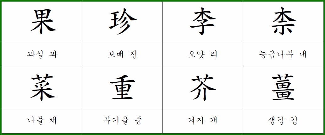 **果珍李柰 菜重芥薑(과진이내 채중개강)**은 **"과일 중 진미는 오얏(자두)과 배이며, 채소 중 중요한 것은 겨자와 생강이다"**라는 뜻입니다.