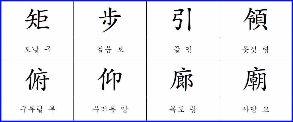 '구보인령 부앙랑묘(矩步引領 俯仰廊廟)'는 "규칙적인 걸음으로 옷깃을 바로잡고(矩步引領), 종묘나 대궐을 우러러보듯 공경히 처신하라(俯仰廊廟)"는 의미를 담고 있습니다.