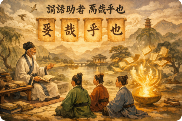 이 구절은 모든 지식과 사상을 담아내는 그릇인 '언어'의 마지막 단계, 즉 문장의 의미를 완성하는 어조사들의 존재를 인지하며 천자문의 지혜를 최종적으로 정리하고 음미하는 깊은 의미를 지니고 있습니다.