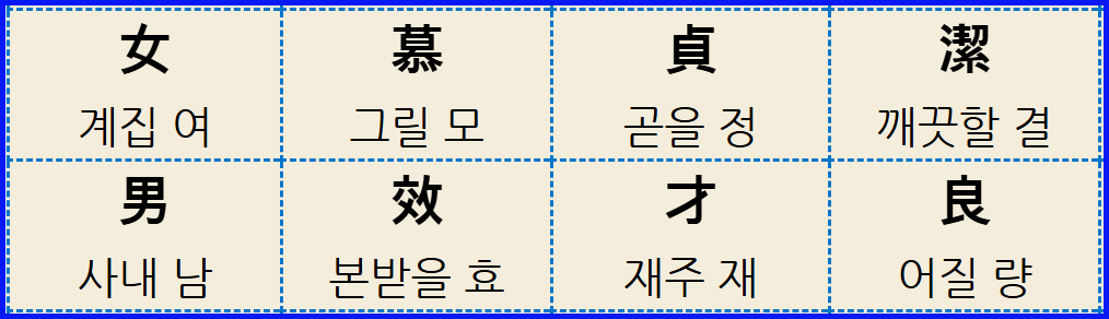 🕯️ 이 구절은 일부 '천자문' 판본에서는 '女慕貞潔(여모정결)'로 표기되기도 하는데, 이는 뒤에 나오는 '紈扇圓潔(환선원결)의 '潔(결)'과 글자가 중복되므로 여기서는 '女慕貞烈(여모정렬)을 채택하여 설명합니다.