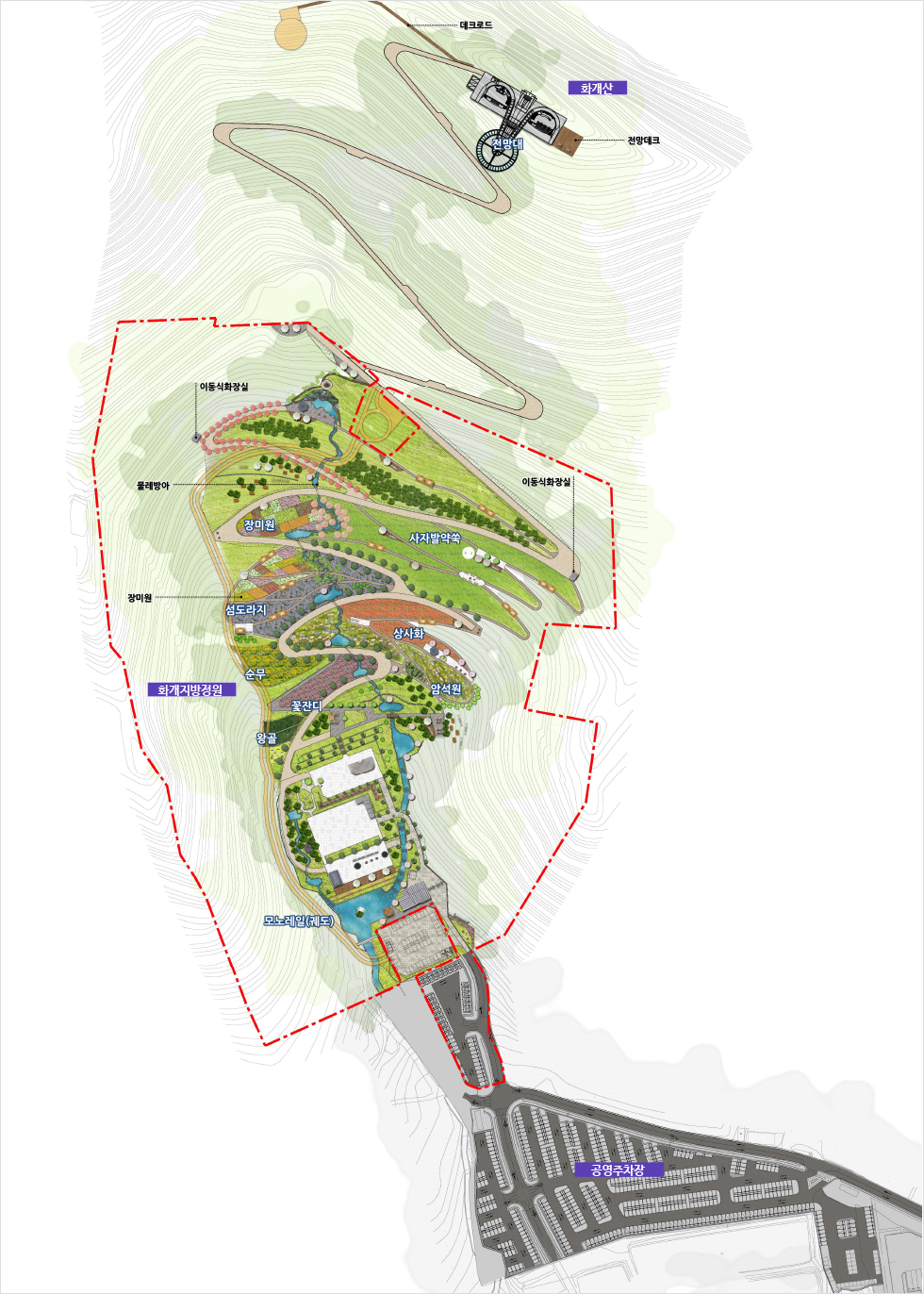 화개정원에는 약 18만 그루의 나무, 관목, 꽃이 5개의 테마 구역(물의 정원, 역사문화의 정원, 추억의 정원, 평화의 정원, 치유의 정원)으로 나뉘어 조성되어 있습니다. 각 구역은 다양한 식물을 선보이며, 계절마다 색다른 매력을 느낄 수 있습니다.