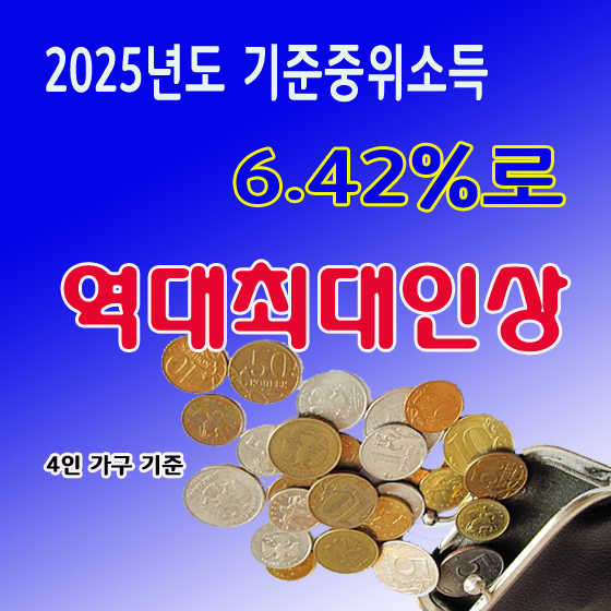 ○ 2025년도 기준 중위소득은 4인 가구 기준으로 2024년 5,729,913원 대비 6.42% 인상된 6,097,773원, 수급가구 중 약 74%를 차지하는 1인 가구 기준으로는 2024년 2,228,445원 대비 7.34% 인상된 2,392,013원으로 결정되었습니다.