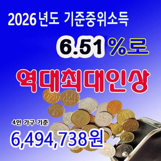 2025년 7월 31일, 보건복지부는 4인 가구 기준 중위소득을 2025년(6,097,773원)보다 6.51% 인상된 6,494,738원으로 발표했습니다. 이는 통계 작성 이래 가장 큰 폭의 상승입니다.